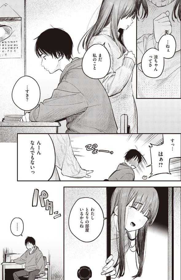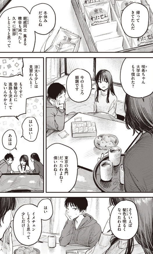 大雪で帰れなくなった彼女をしばらく泊めることになった涼太(りょうた)は、昔のように添い寝しようと布団に潜り込んできた咲希ねぇに思わず勃起してしまう。